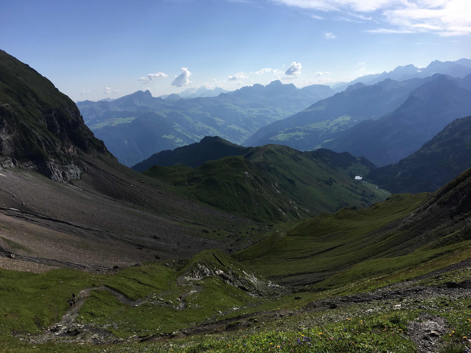 Nach einer kurzen Pause geht es weiter. Es folgt ein sehr langer Abstieg. Er ist sehr angenehm. Nirgendwo geht es zu steil runter. Ganz gemütlich führt der Wanderweg uns nach unten. Die Landschaft ist sehr Hügelig und erinnert mich ein wenig an Island. Bei der Blakenalp machen wir unsere Mittagspause. Eine feine Suppe haben sie hier.