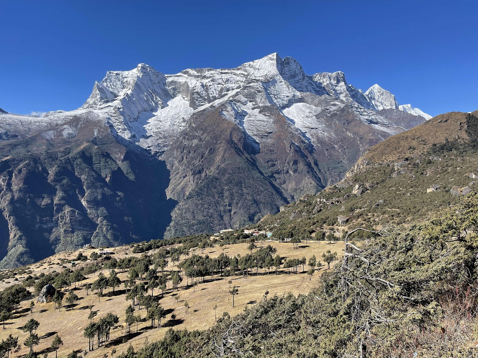 Hier merke ich die Höhe schon deutlich. Ich muss viel öfter anhalten und durchatmen. Namche Bazaar liegt auf 3460 Metern und nun geht es rauf auf 3880 Meter. Kurz vor dem Ziel sehe ich drei Adler vorbeifliegen. Ein toller Anblick. Schließlich kommen wir zum Aussichtspunkt beim Everest View Hotel. Nun sehe ich zum ersten Mal schemenhaft den Mount Everest. Er ist leider hinter einer Schleierwolke etwas versteckt. Der ganze Himmel ist blau. Nur genau beim Everest hat es Schleierwolken. Hier machen wir eine Pause.