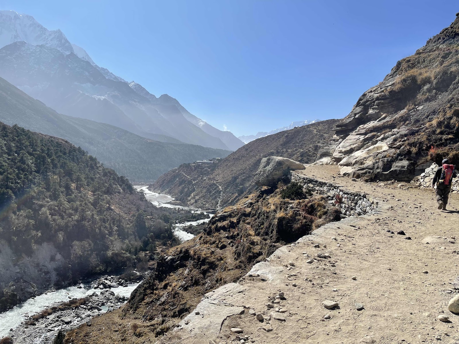 Der letzte Wandertag ist auch der Kilometermässig längste Tag. Um 07:00 Uhr wandern wir los. Es geht gleich recht steil runter. Im Zickzack wandern wir runter zum Fluss. Dann geht es wieder über die Hillary-Brücke und runter zum Fluss. Am Fluss entlang geht es den schon bekannten Weg zurück. Vorbei an mehreren Dörfern und mehrmals über den Fluss hin und her. In einem Dorf machen wir unsere Mittagspause.