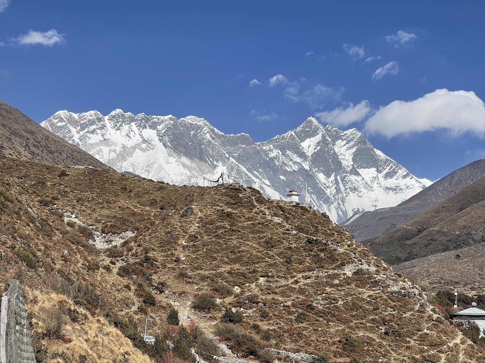 So. Jetzt heißt es aber weitergehen. Es kommen immer mehr Leute rauf und der Platz wird langsam voll. Die Spikes haben wir wieder eingepackt. Diese Seite wird von der Sonne voll beschienen und ist zum Glück Schneefrei. Die ersten etwa 50 Meter vom Abstieg sind etwas ausgesetzt und es gibt ein paar Tritte zu überwinden. Ich kann mich aber gut am Fels festhalten. Dann wird es es wieder einfacher. Beim See unten ist es flacher und dort geht der Weg nochmals durch ein Schneefeld. Da es aber flach ist und der Schnee von der Sonne aufgewärmt wurde, ist es kein Problem ohne Spikes durchzulaufen. Der Abstieg geht mal steiler, mal recht flach über mehrere Ebenen runter. Es wird immer Grüner. Mehr als Gras, Moos und ein paar Blumen wächst hier aber nicht. Endlos zieht es sich dahin. Die Aussicht bleibt fantastisch. Einmal sehe ich im Tal unten Dingboche. Wir gehen aber heute nicht mehr so weit runter. Irgendwann bin ich im Robotermodus und wandere nur noch hinter meinem Guide her. Endlich kommt Chuckhung in Sicht. Bin ich froh! Viel weiter wäre ich nicht mehr gekommen. Ok, nach einer Pause wahrscheinlich schon. Kurz darauf sind wir um 14:00 Uhr bei der Lodge angekommen. Was für ein Tag! Den Rest des Tages ruhe ich mich aus.
