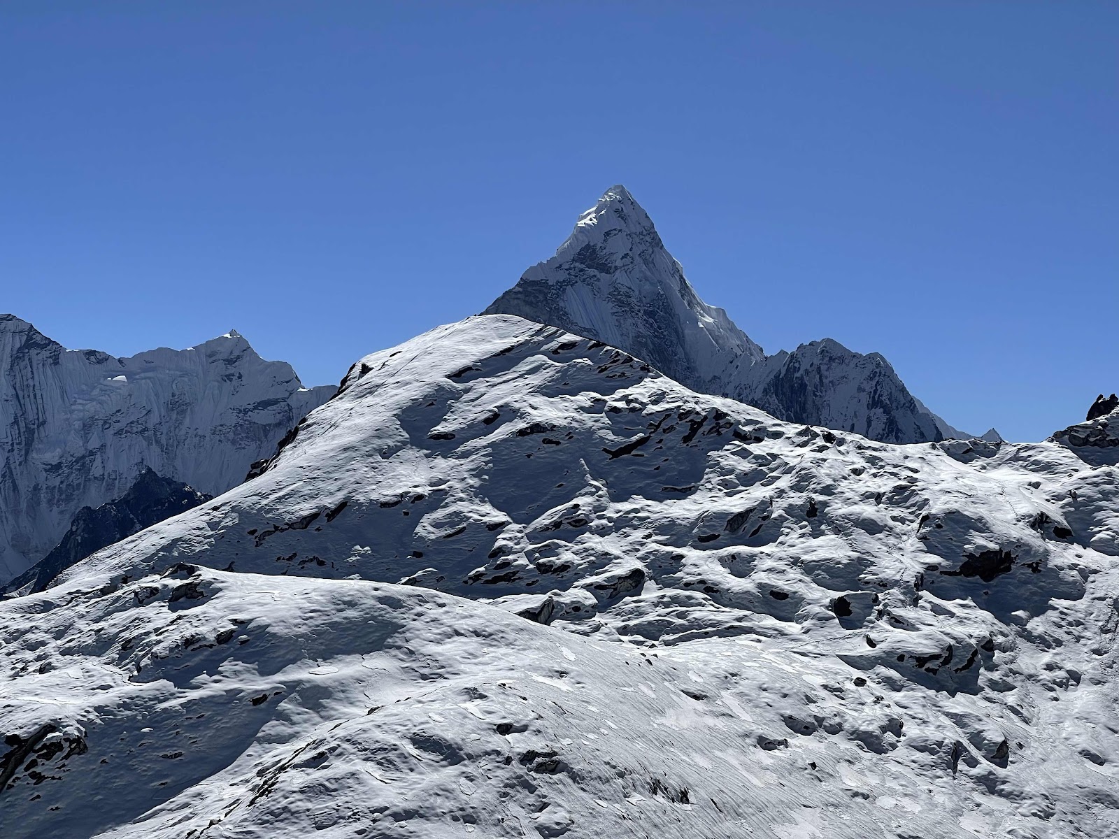Die Spitze mit dem Schneeschleier ist der Everest. Davor ist die Nuptse, rechts der Lotse. Rechts im Bild ist die Ama Dablam.